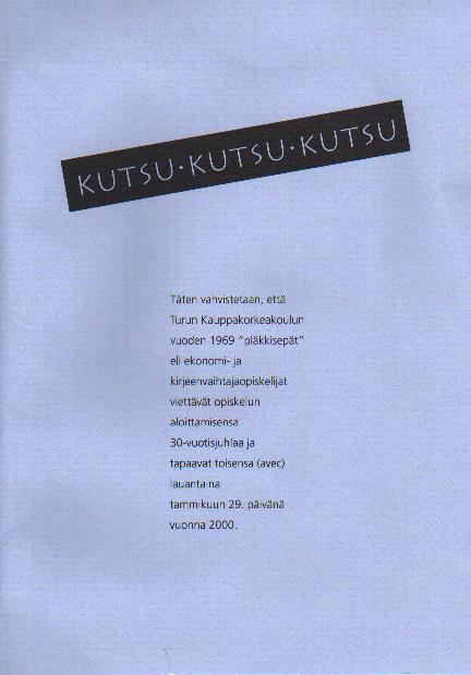 Turun Kauppakorkeakoulun 1969 vuosikerran kurssijuhlat pidettiin 29.01.2000 Naantalin Kylpylässä. Mukana juhlissa meitä oli noin 60 kurssilaista + avec eli n. 120 henkeä! Naantalin Kylpylä loi juhlille upeat puitteet. Illan isäntäpari Pekka ja Ritva olivat huolehtineet hienolla tavalla siitä, että tarjoilut ja palvelu olivat ykkösluokkaa. Illan ohjelma oli hauskaa palauttaen mieliimme joskus riehakkaatkin opiskeluajat. Tanssilattia oli ahkerassa käytössä - jalka nousi keveästi vielä viisikymppisiltä kun rokki soi!