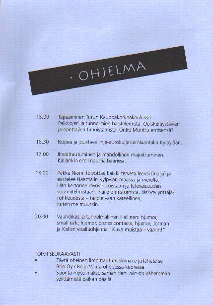 Lauantaina 29. 1. vuonna 2000, noin kello 15.00 saapui väkevältä PALOLIEMELTÄ tuoksuva, itsensä KYLLÖSEKSI syönyt, pönäkkä joukko entisiä kauppatieteen opiskelijoita mainehikkaaseen Turun Ky:n ruokalaan yrittäen tunnistaa toisiaan monen vuoden jälkeen. Hyväkuntoisimmat saapuivat Pappa-TUNTURI-mopoilla. Joku VAURAannäköinen johtaja ajoi pihaan hevosten vetämillä KIESILÄISILLÄ ja Kakskerran kartanonherra Monttu-MONNONEN tuotiin mustallamaijalla SIRENit ulvoen paikalle.